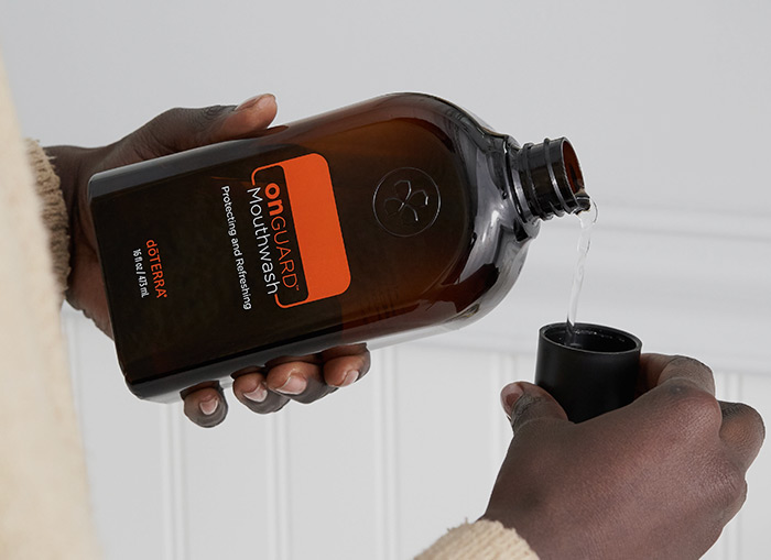 Swish with doTERRA On Guard Mouthwash after brushing and flossing to support a healthy mouth and long-lasting fresh breath.